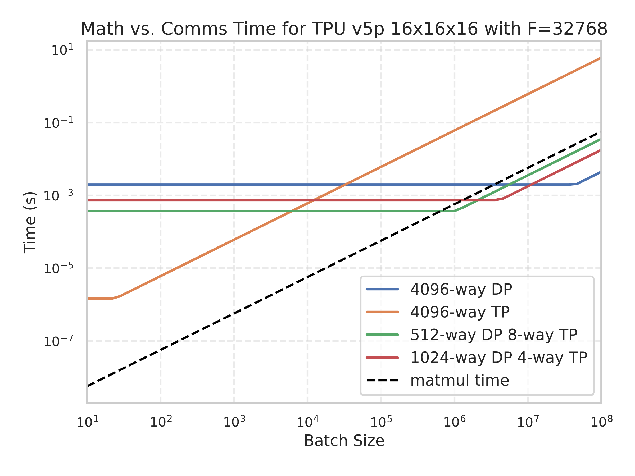 \[\begin{align} \frac{4 \cdot B \cdot D \cdot F}{Y \cdot C} > \frac{2 \cdot 2 \cdot (B \cdot D)}{W_\text{ici}} \end{align}\] \[\begin{align} \frac{F}{Y \cdot C} > \frac{1}{W_\text{ici}} \end{align}\] \[\begin{align} F > Y \cdot \frac{C}{W_\text{ici}} \end{align}\]따라서 예를 들어, TPUv5p의 경우 bf16에서 $C / W_{ici} = 2550$이므로, $Y < F / 2550$까지만 텐서 병렬 처리를 수행할 수 있습니다. 여러 ICI 축이 있는 경우 $T_\text{comms}$가 $M_Y$배만큼 감소하므로 $Y < M_Y \cdot F / 2550$을 얻습니다.