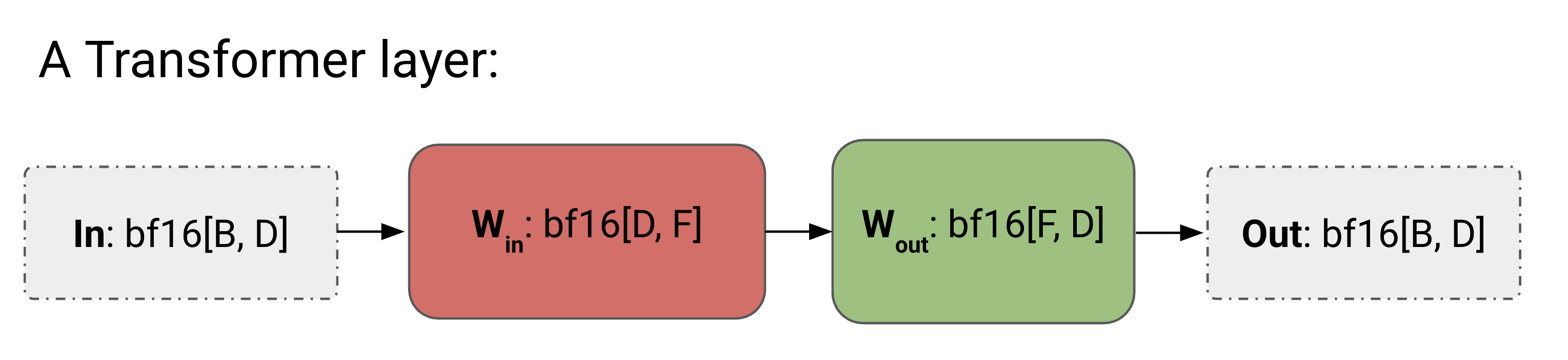 bf16[D, F] (up-projection) 과 Wout: bf16[F, D] (down-projection), 그리고 입력 In: bf16[B, D] 의 스택으로 취급합니다.Forward pass: compute Loss[B]